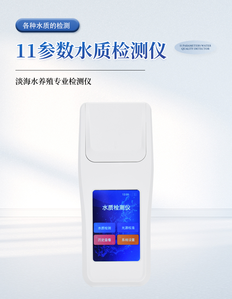 简要描述: 11参数水质检测仪IN-SS11是一款适用于工业污水、水产养殖、河流监测、游泳场馆等领域的检测仪,配合快速显色检测试剂,可“快速、简单、准确、稳定”进行测量,拥有精美的外观造型,简单的操作界面,准确的检测系统,帮助用户获得精细的数据,可更准确、有效的分析水体状况,提前预防养殖风险,及时避免损失。