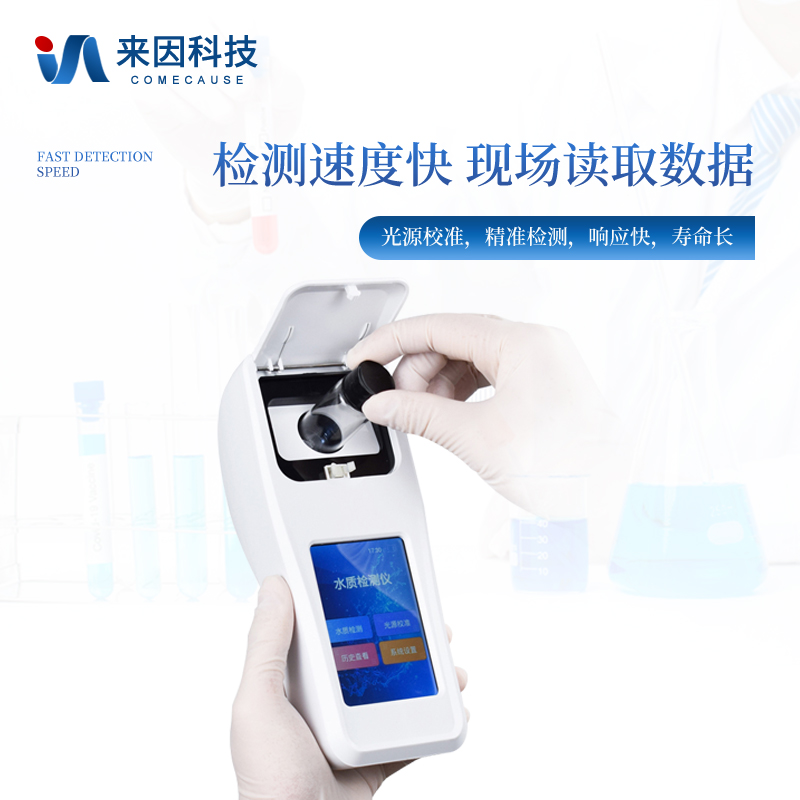 利用白光LED对显色液进行照射,传感器可得出其三光色值,首先检测空白液的三光色值,再检测被测样品的三光色值,根据波长与颜色的关系,按照试剂反应后的颜色,将三光色值归一化,根据吸光度公式A=lg(I0/I1),其中I0为入射光强,I1为透射光强,得到A值后,仪器根据内置标准曲线其对应的吸光度(A)可准确计算出检测项目在水体中的浓度值。