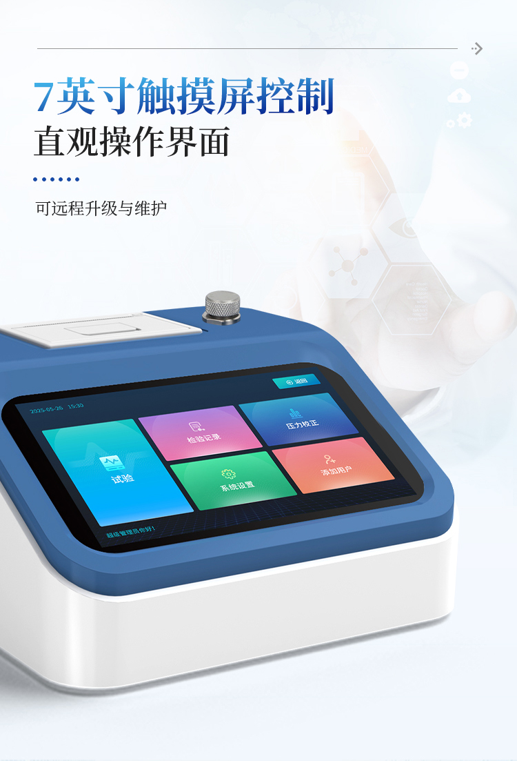 简要描述: 泄漏与密封强度试验仪7英寸触摸屏控制,一键式操作、直观操作界面,可远程升级与维护;采用SMC知名品牌进口元器件,正压设计原理,操作简单、性能稳定可靠;内置压力传感器,可精确测定试样内部压力;试验曲线实时展示试验过程中压力的变化趋势,试验数据智能统计;提供破裂测试、蠕变测试、蠕变至破裂测试试验模式。