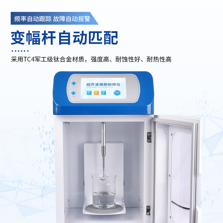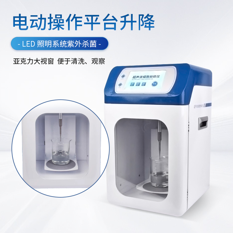 超声波细胞粉碎仪(一体式)将隔音箱融入到主机中形成一体化。功能齐全、外观新颖、性能可靠。仪器采用大屏液晶显示;中央微机集中控制,超声输出、间隙时间、超声功率、温度可任意设定,样品温度监测显示,频率自动跟踪,故障自动报警等功能。