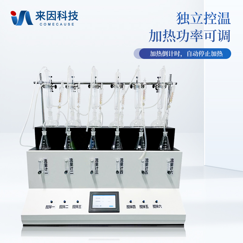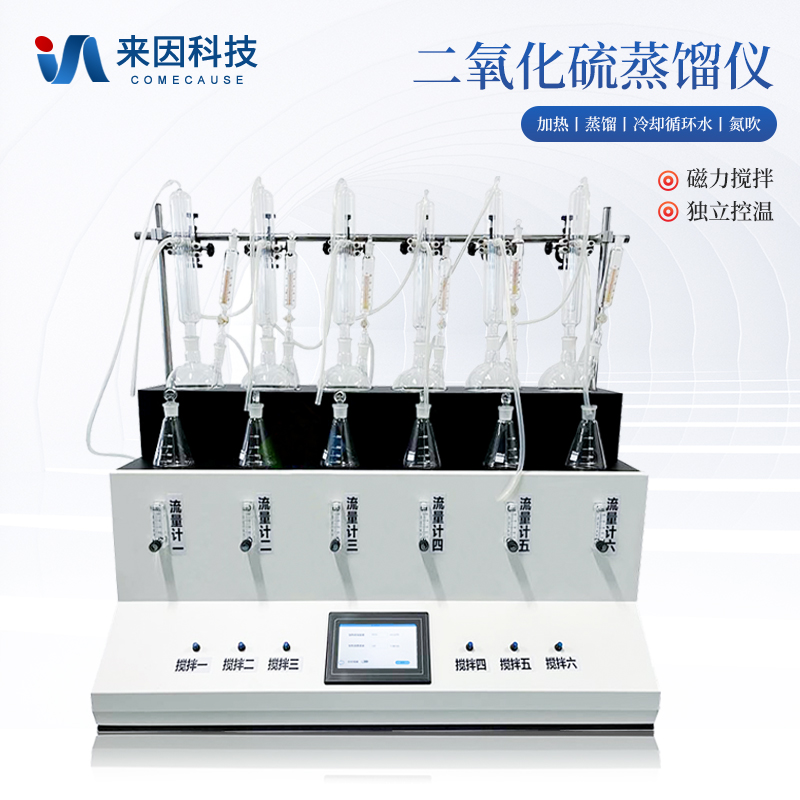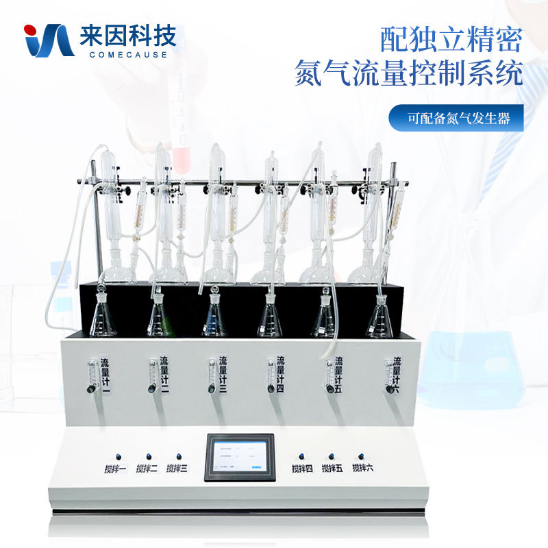 主要原理是根据药典中所提供的检测方法,将中药材以蒸馏法进行处理,样品中的亚硫酸盐系列物质加酸处理后转化为二氧化硫后,随氮气流带入到含有双氧水的吸收瓶中,双氧水将其氧化为硫酸根离子,采用酸碱滴定法测定,计算药材及饮片中的二氧化硫残留量。本产品在严格遵循药典要求的基础上,整合加热,蒸馏,水循环及氮吹等功能为一体,可同时提供3-6个样品(空白样,平行样)的处理,从而极大的提高了检测数据的精度和减少了工作时间。