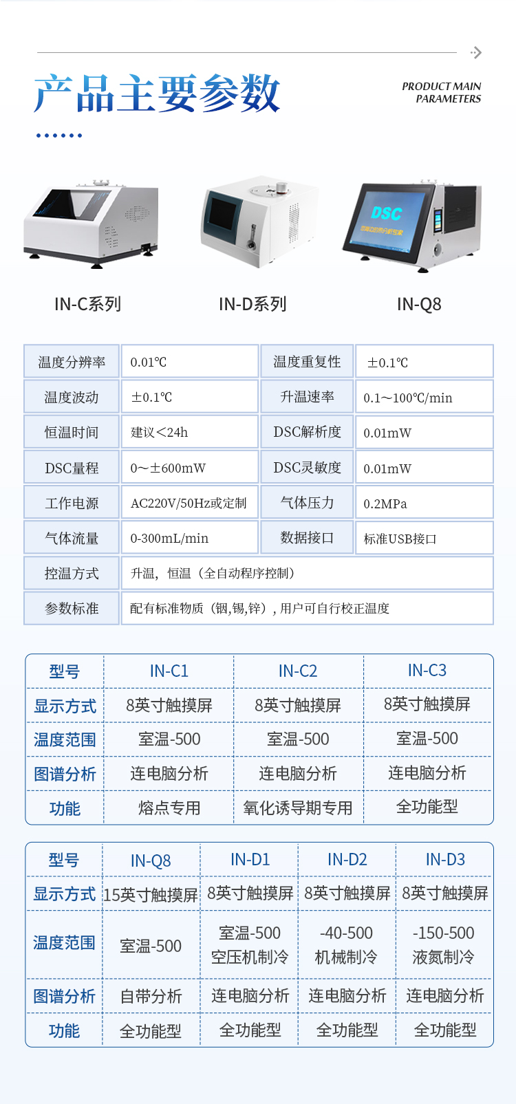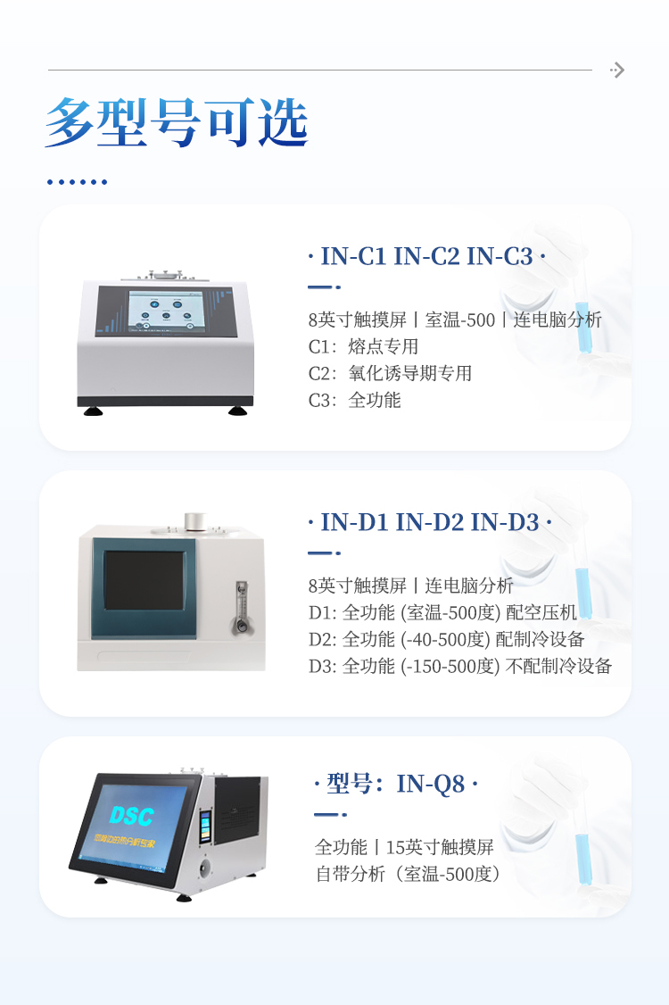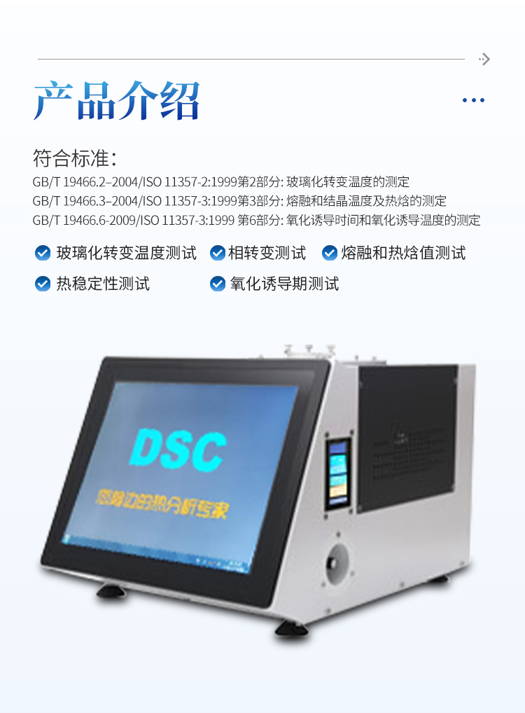 差示扫描量热仪为触摸屏式,可进行玻璃化转变温度测试、相转变测试、熔融和热焓值测试、产品稳定性、氧化诱导期测试。