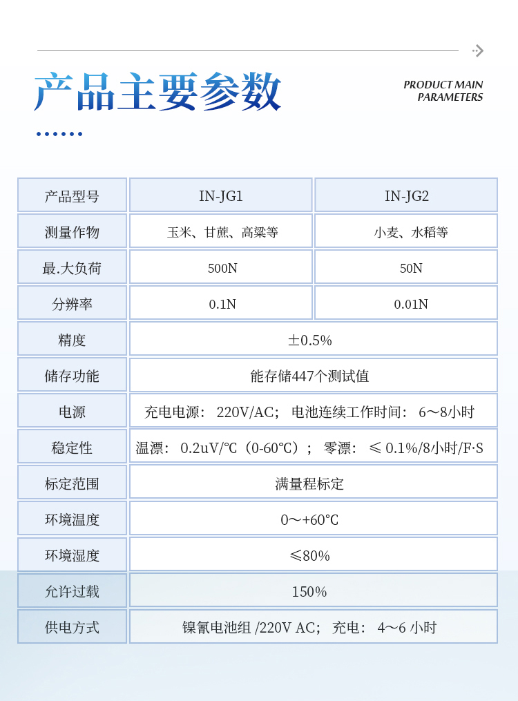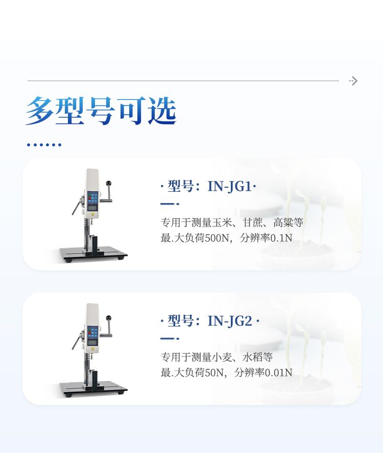 1、三种不同测头:可进行茎杆弯折性能测量、茎秆抗压强度测量、茎杆组织结构(穿刺)强度测量;弯折支架距离可调,并标有刻度。