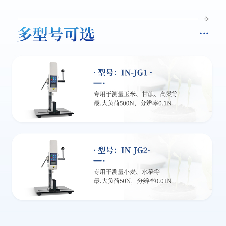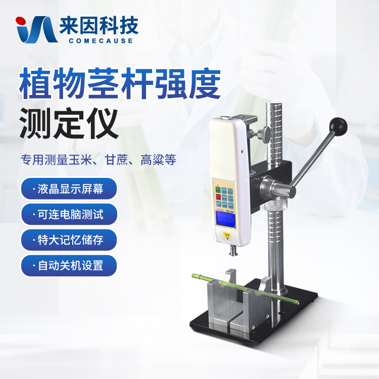 植物茎秆的强度是决定作物抗倒伏能力的一个主要因素,长期以来玉米,高梁、烟草等的倒伏给作物的机械收割造成很大的困难。从机械化水平来说,造成大量的粮食浪费。另外,作物倒伏导致光照不充分,使其生产量受到极大的限制。在作物生长的各个阶段对其茎秆进行活体测量,进而根据茎杆纤维层的抗弯阻力与抗倒伏能力的相关性对群体测量数据进行统计处理,对作物的栽培和育种具有重要意义。植物茎秆强度仪采用拉压力传感器,通过针刺、压碎、折断的方式测出茎秆断裂或者屈服瞬间产生的最大力,即茎秆的强度。