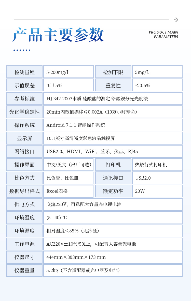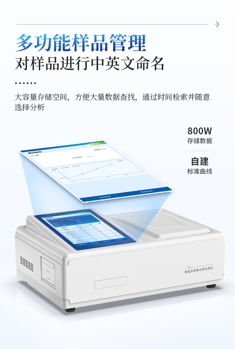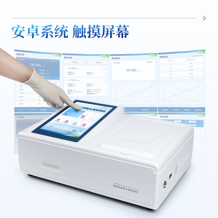 本仪器主要检测水中硫酸盐含量指标,兼具智能数据分析功能,图表、列表显示数据,分析一目了然;高清晰度彩色液晶触摸显示屏,androids智能操作系统,中文显示界面,中英文键盘,人性化操作,使用更简单。