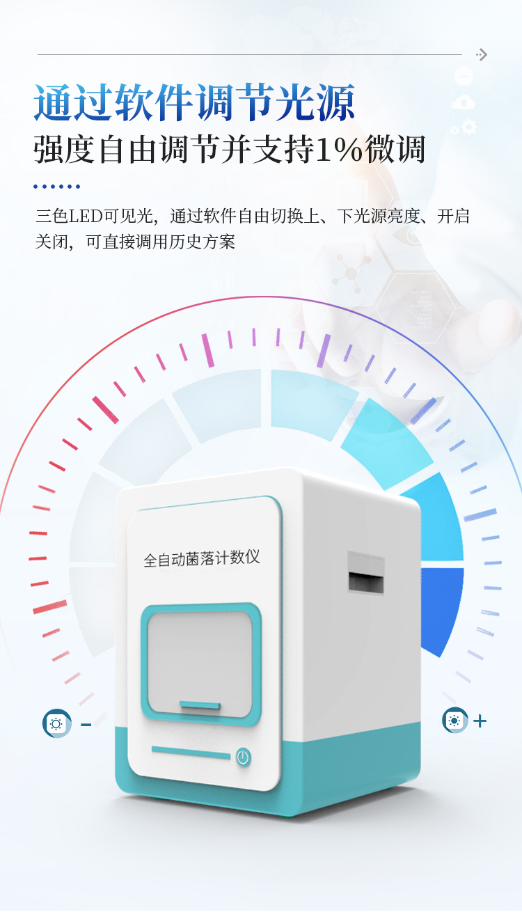 该系列全自动菌落计数仪配备了灵活的上、下双光源系统,用户可以根据不同培养皿的类型、菌落特性以及背景情况,用软件自由调节光源以获得最佳的成像效果。