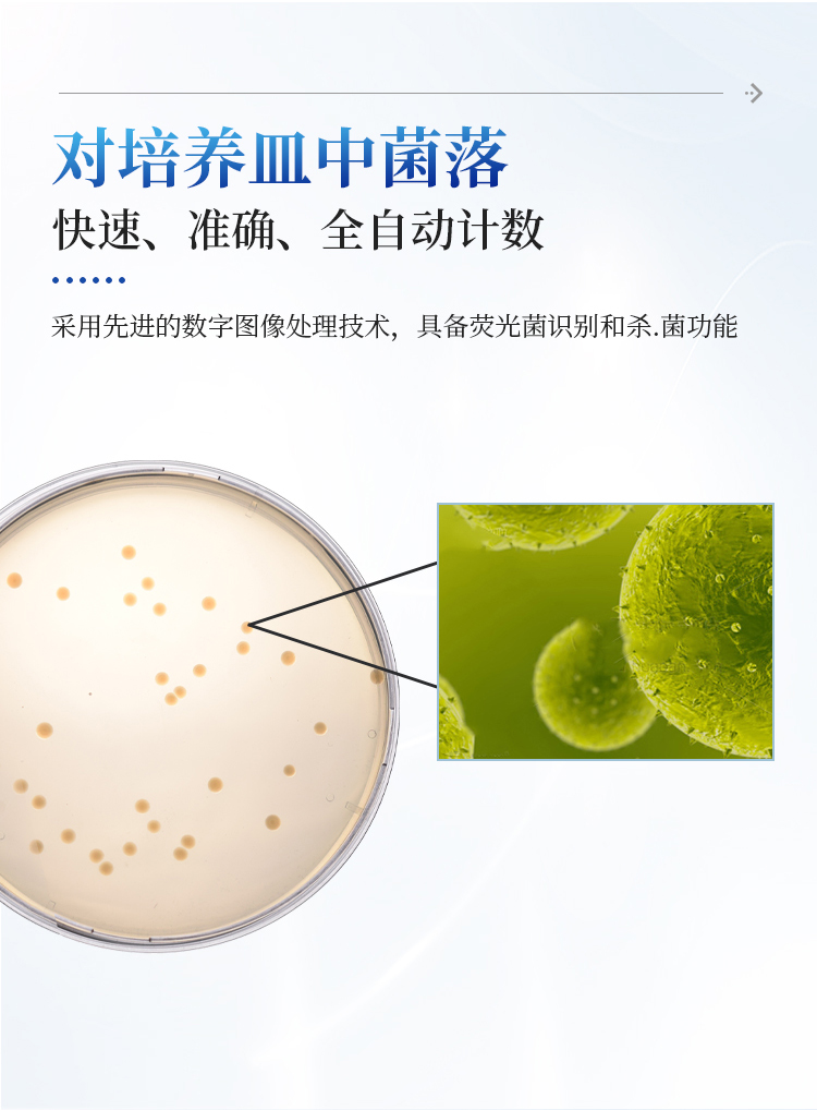 本产品是一款集图像采集、数据处理与统计于一体的自动菌落计数,广泛应用于食品、药品、化妆品、环境监测、医疗卫生、科研院校等领域的菌落计数。该仪器采用先进的数字图像处理技术,具备荧光菌识别和杀菌功能,可实现对培养皿中菌落的快速、准确、全自动计数,显著提升实验效率,降低人工误差。