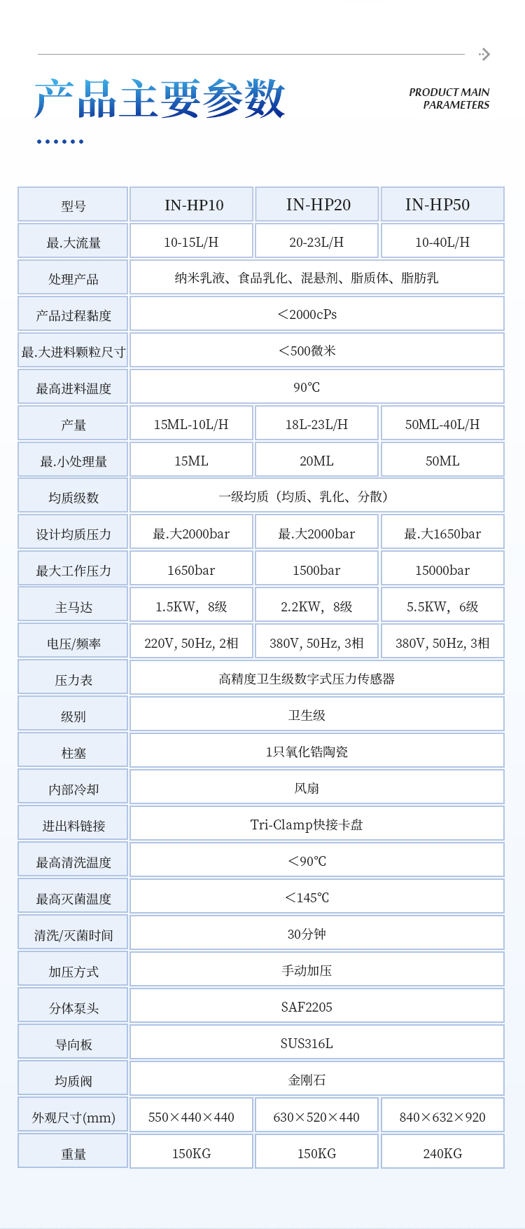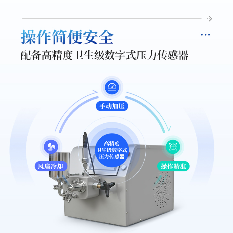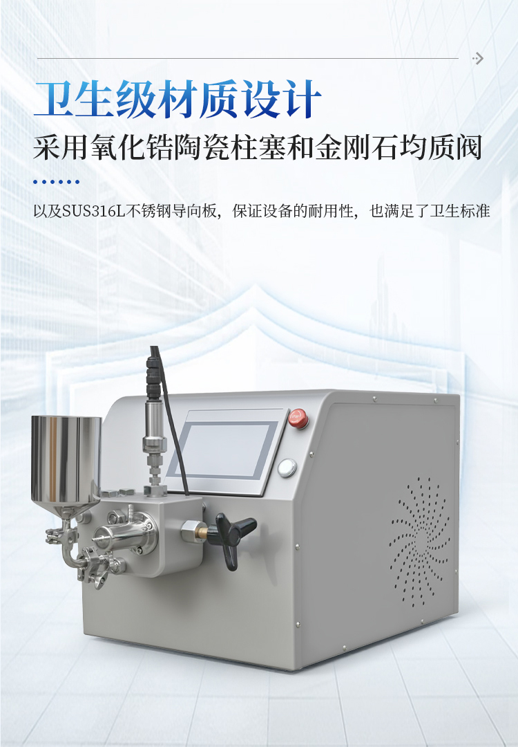 3、卫生级设计:采用氧化锆陶瓷柱塞和金刚石均质阀,以及SUS316L不锈钢导向板,不仅保证了设备的耐用性,也满足了卫生标准,特别适用于制药、化妆品等行业。