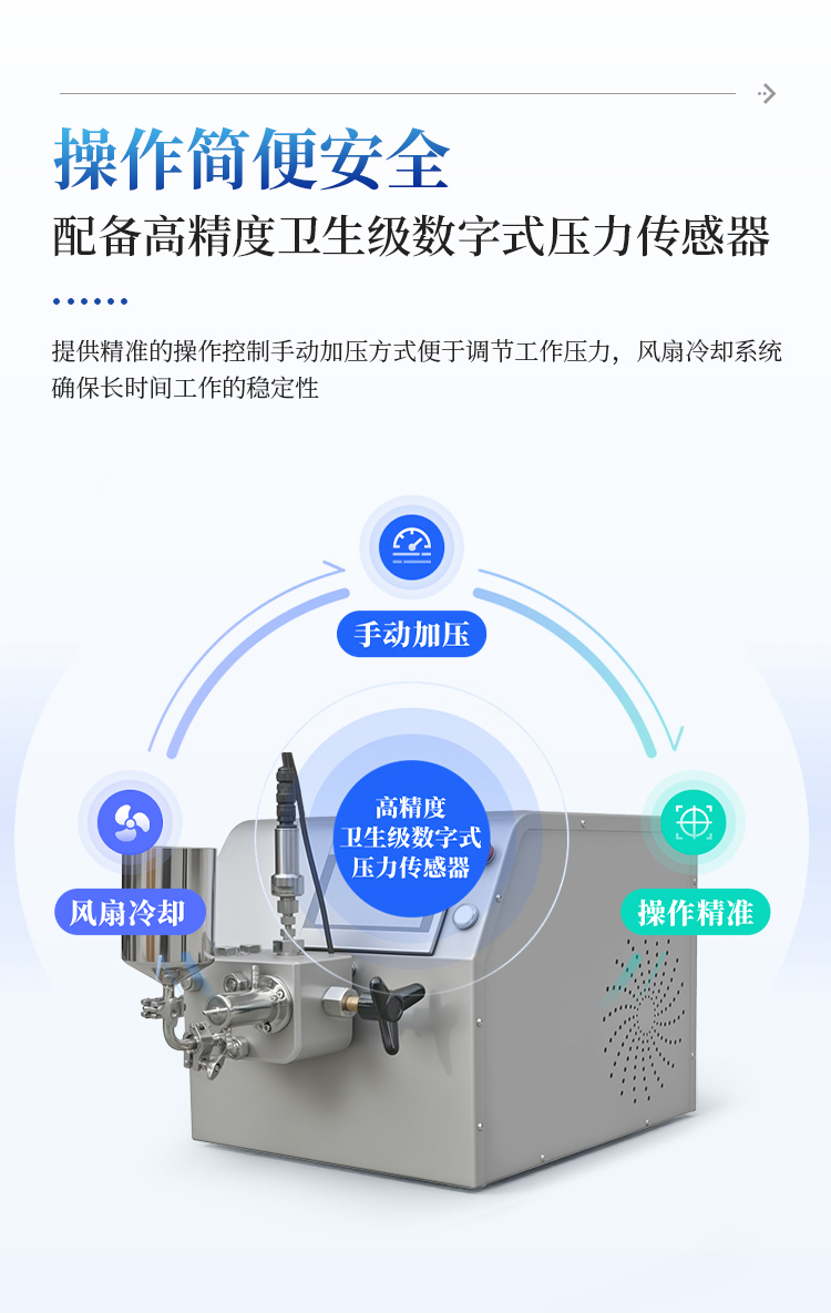 4、操作简便与安全:配备高精度卫生级数字式压力传感器,提供精准的操作控制。手动加压方式便于调节工作压力,风扇冷却系统确保长时间工作的稳定性。