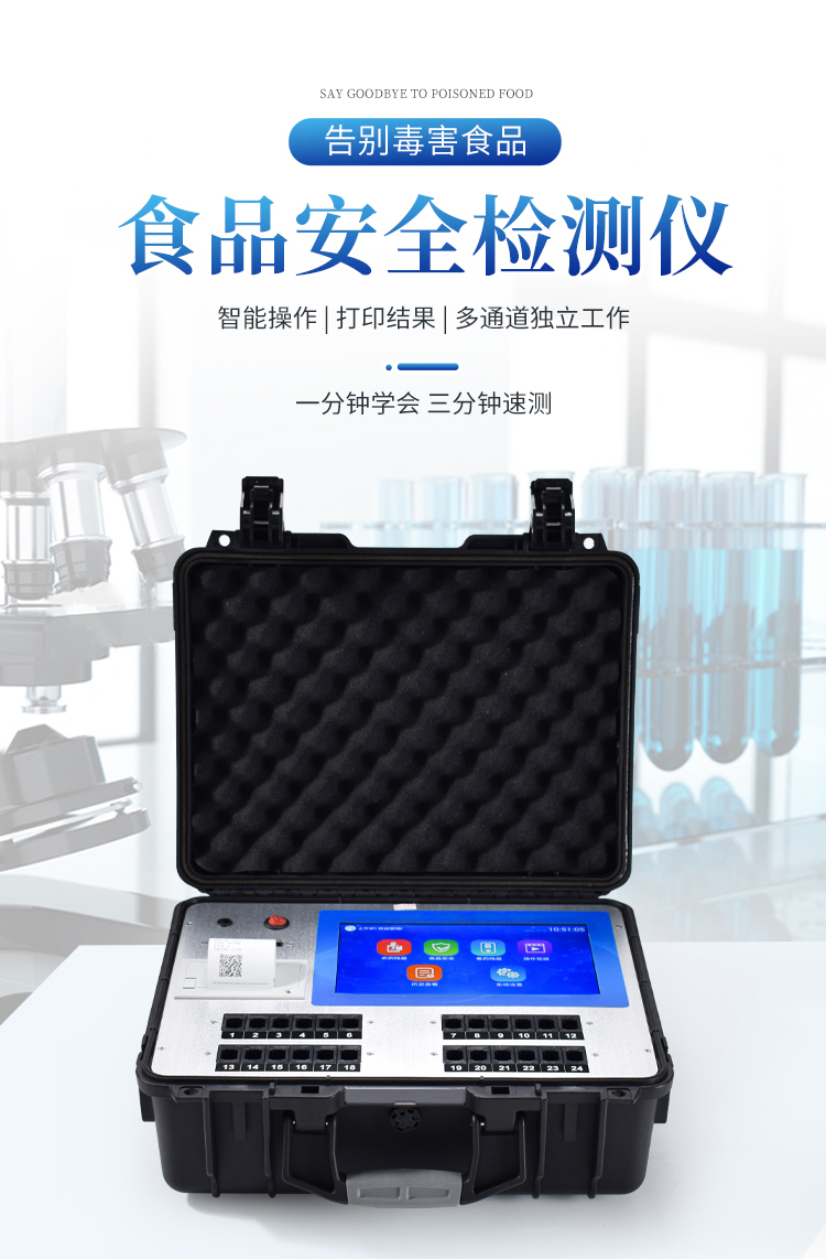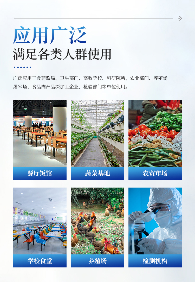 该多功能食品安全检测仪为集成化食品安全快速检测分析设备,广泛应用于市场监管局、检测中心、卫生监督部门、农业部门、院校及各单位食堂、食品肉产品深加工企业、商超市场、司法部门、餐饮机构、养殖场、屠宰场、检验检疫部门等单位使用。