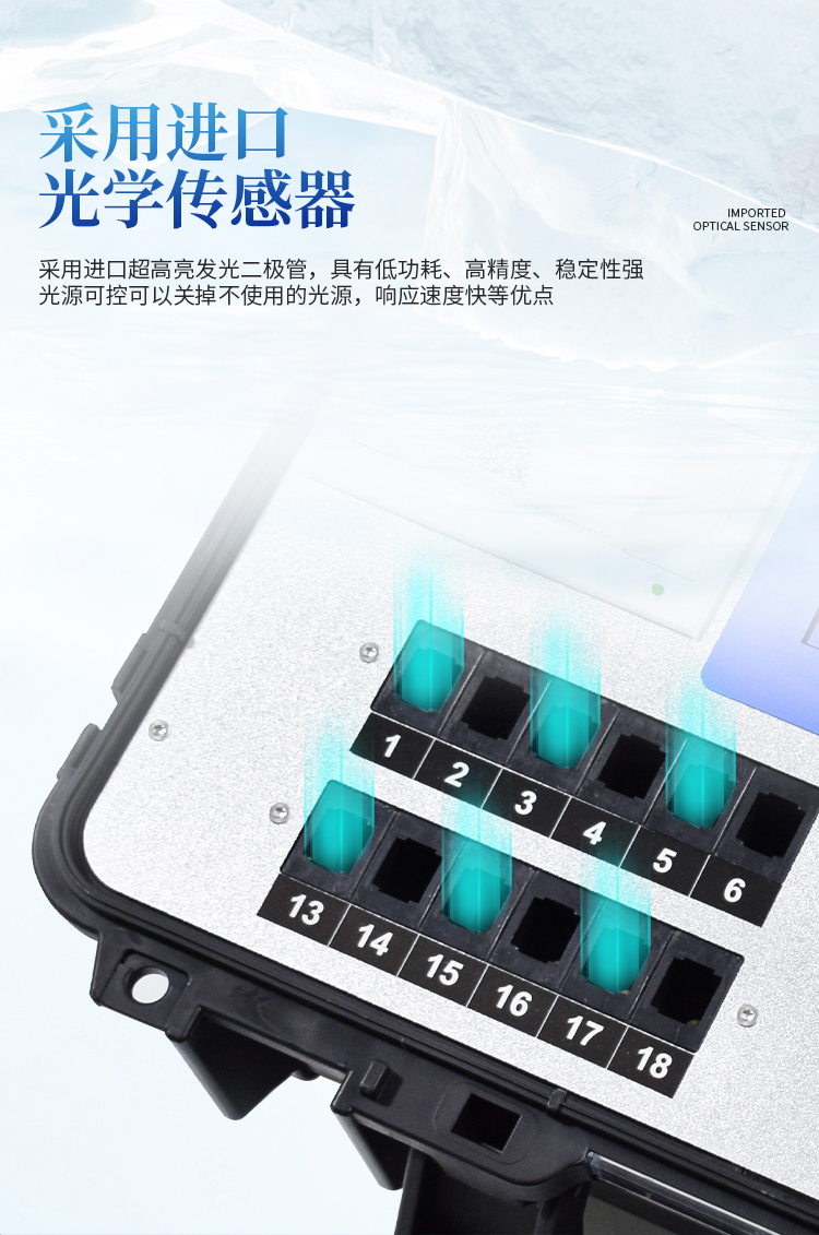 4、★四波长冷光源,24个检测通道,每个通道均配置410、520、590、630nm波长光源,标配先进的光路切换装置,专业光路切换功能可实现最多64波长,并且所有检测项目可实现所有通道同时检测。
