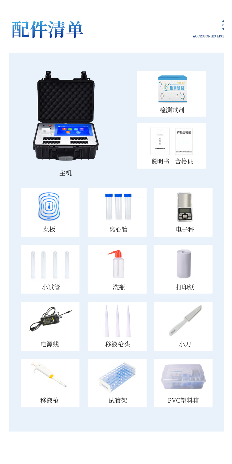 多功能食品安全检测仪可快速检测200多项目,包含非食用化学物质、滥用食品添加剂、农药残留、兽药残留、重金属、病害肉、营养强化剂、抗生素类残留、激素类残留、真菌毒素类残留、化学类残留等现场的定性定量检测。