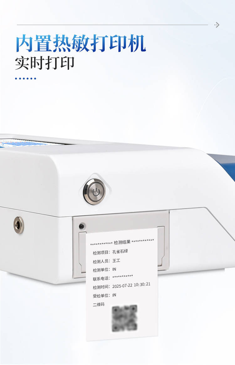 10、检测结果:报告出检测项目、被测物质的浓度、检测单位、被检查单位、检验员、检测时间、检测限等信息可在触摸屏上显示,可通过仪器内置打印机输出