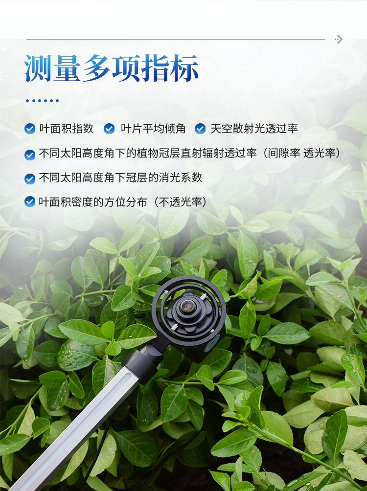 鱼眼镜头可以伸入至冠层中:镜头安装在摇臂一端,由于小巧和带有测量杆,可以方便地水平向前或垂直向上伸入到冠层不同高度处,快速地进行分层测量,测出群体内光透过率和叶面积指数垂直分布图;