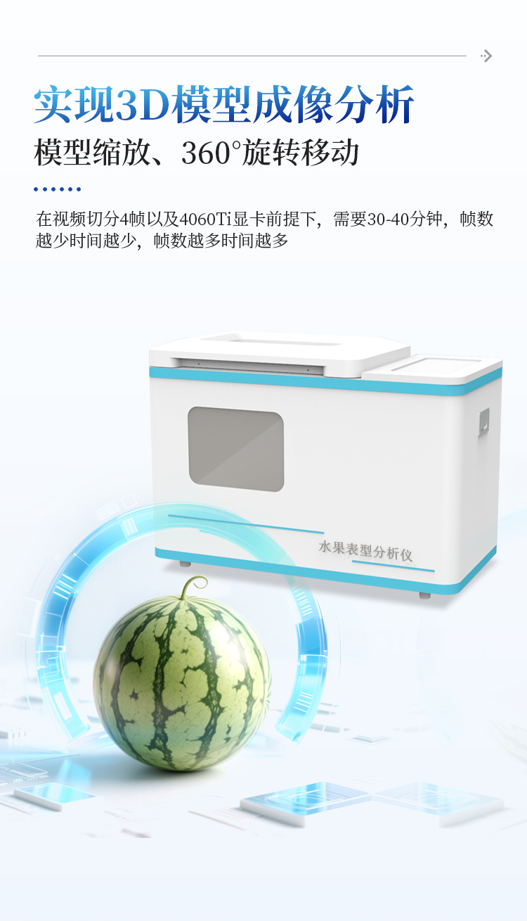 简要描述: 水果表型分析仪是根据图像识别、3D Gaussian Splatting等技术实现模型成像以及分析的。本产品使用了最新的AI成像分析技术,在多视角的条件下对苹果、橘子、梨、西瓜等水果进行扫描,通过生成3D点云图并动态绘制水果表面纹理等操作构建三维的水果模型。同时在进行模型成像过程中也会对水果的形态、纹理、颜色等特征进行分析。