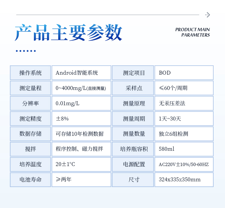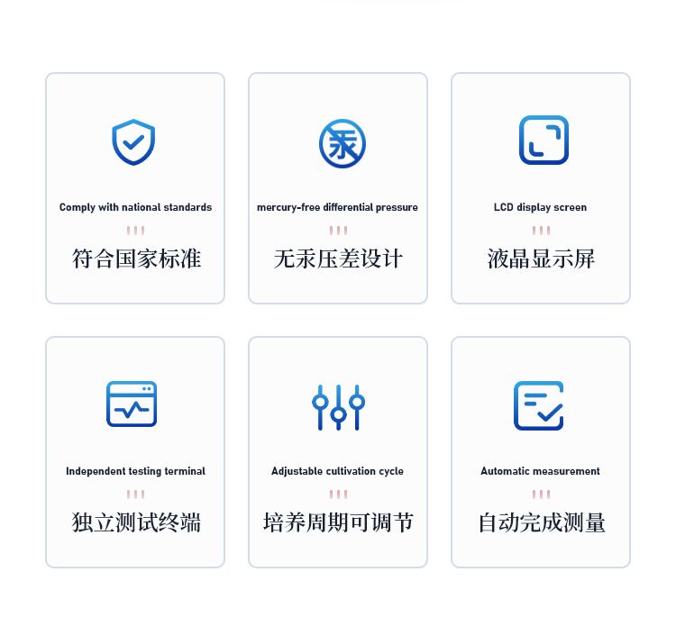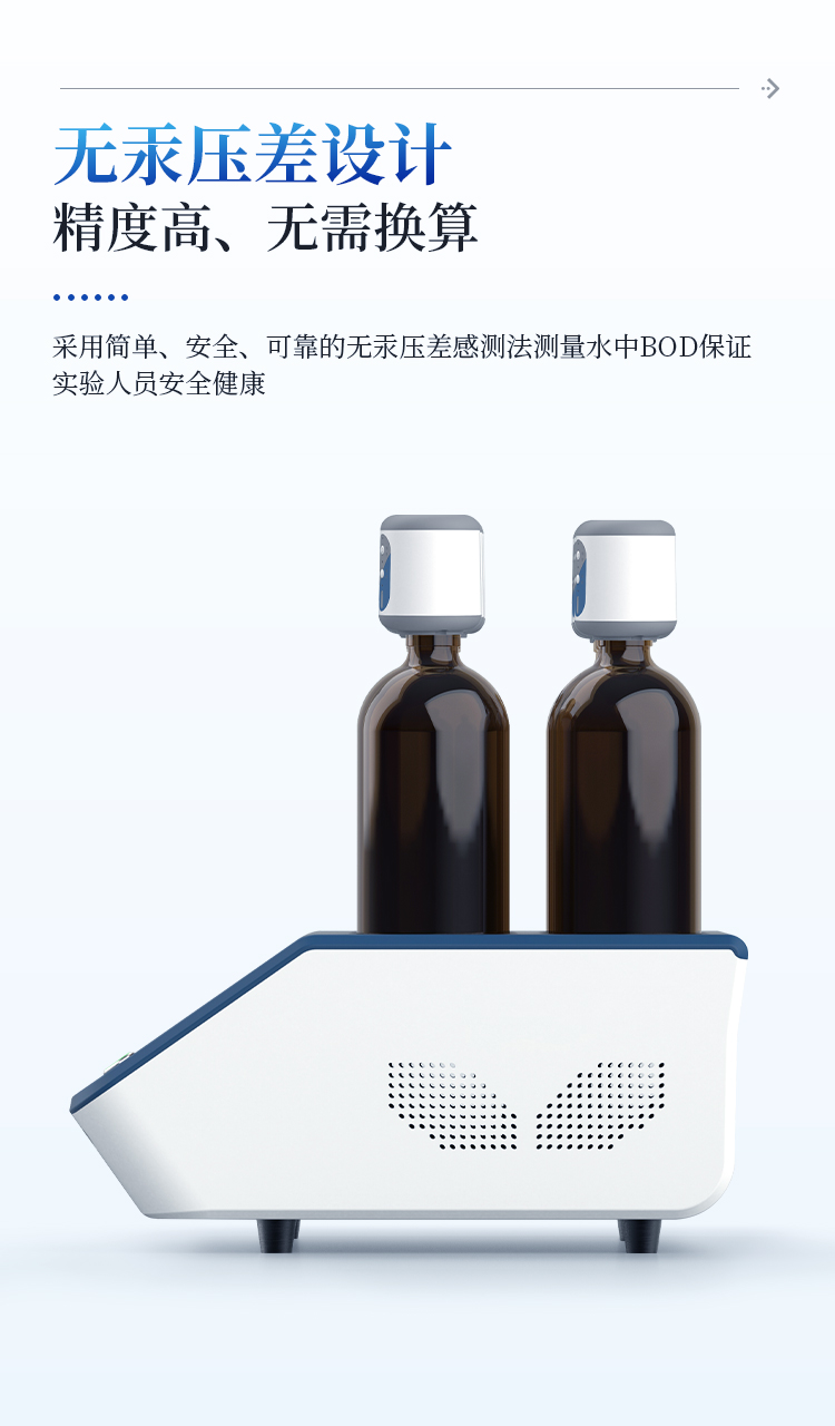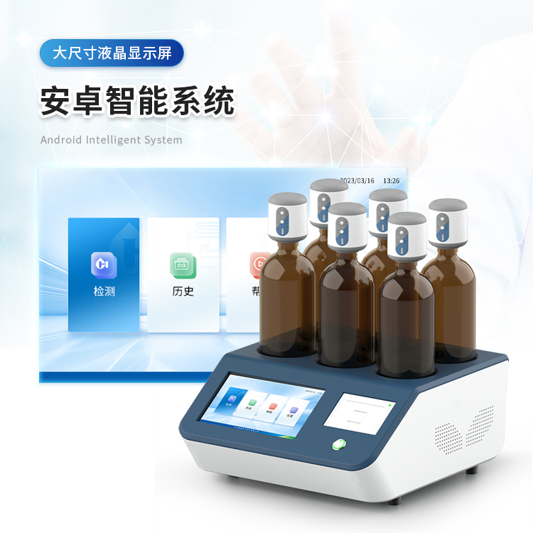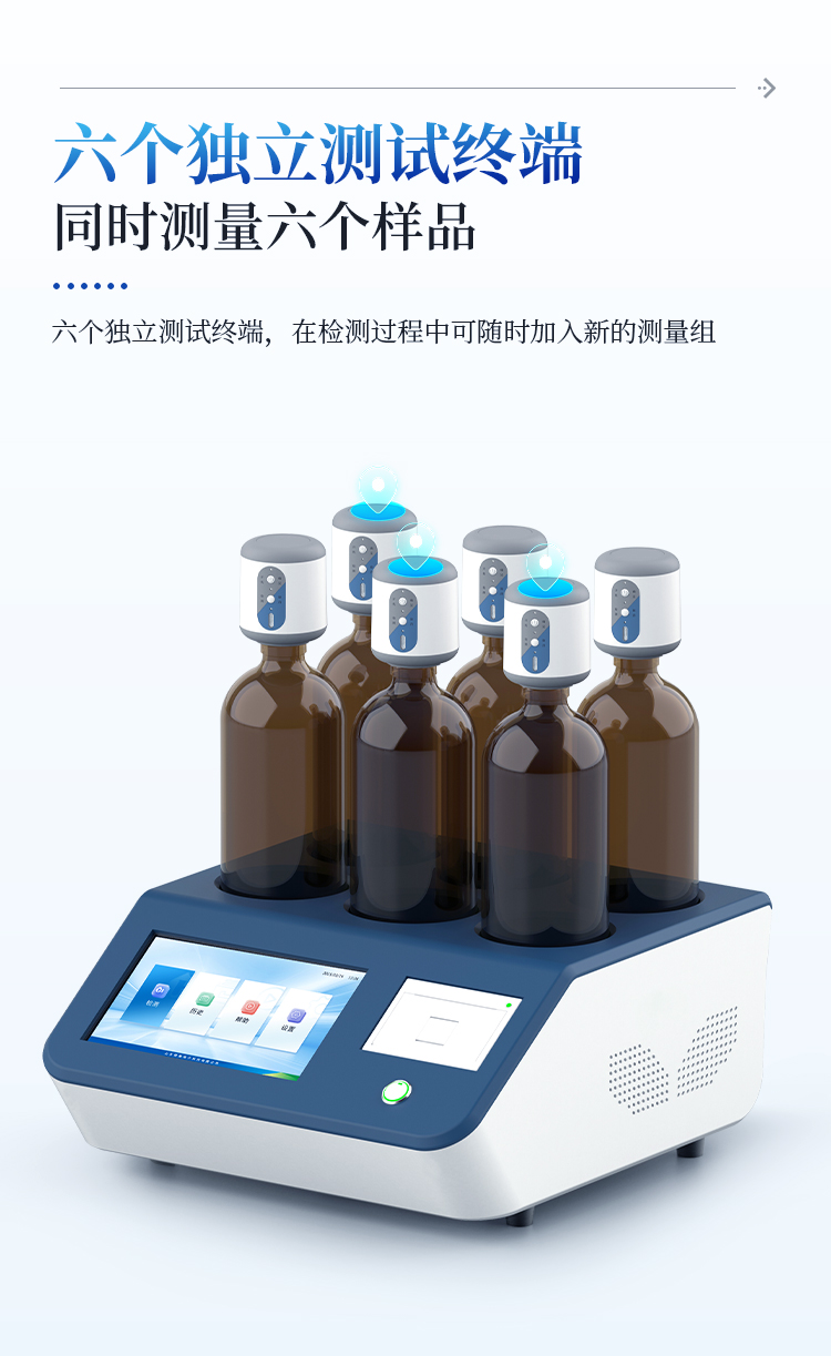 简要描述: BOD快速测定仪采用国际先进的无汞压差法,无汞污染,且数据准确可靠;6个测试终端,独立控制,在检测过程中可随时加入新的测量组;androids智能系统,操作交互性体验更好,更加简便快捷;7英寸液晶触摸屏,人性化设计的人机交互,所有数值对比显示,简单直观;无需人工换算,仪器可直接显示BOD浓度值,多组数据可在统一界面显示。